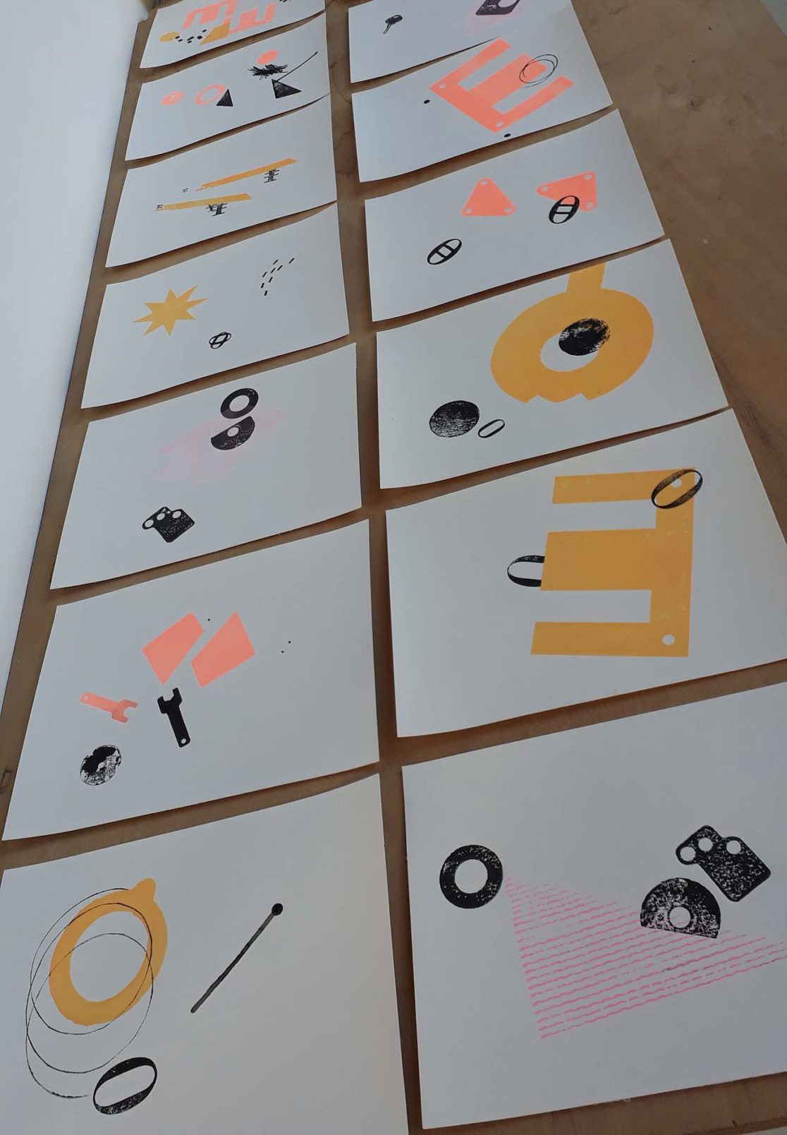 Exposition « Détournement/Multiples » à l’Épicerie Moderne (Feyzin).Mural intérieur éphémère (3×6 m)Mural extérieur (3×6 m)Exposition de 12 monotypes (50×70 cm — Gravure et transfert carbone)